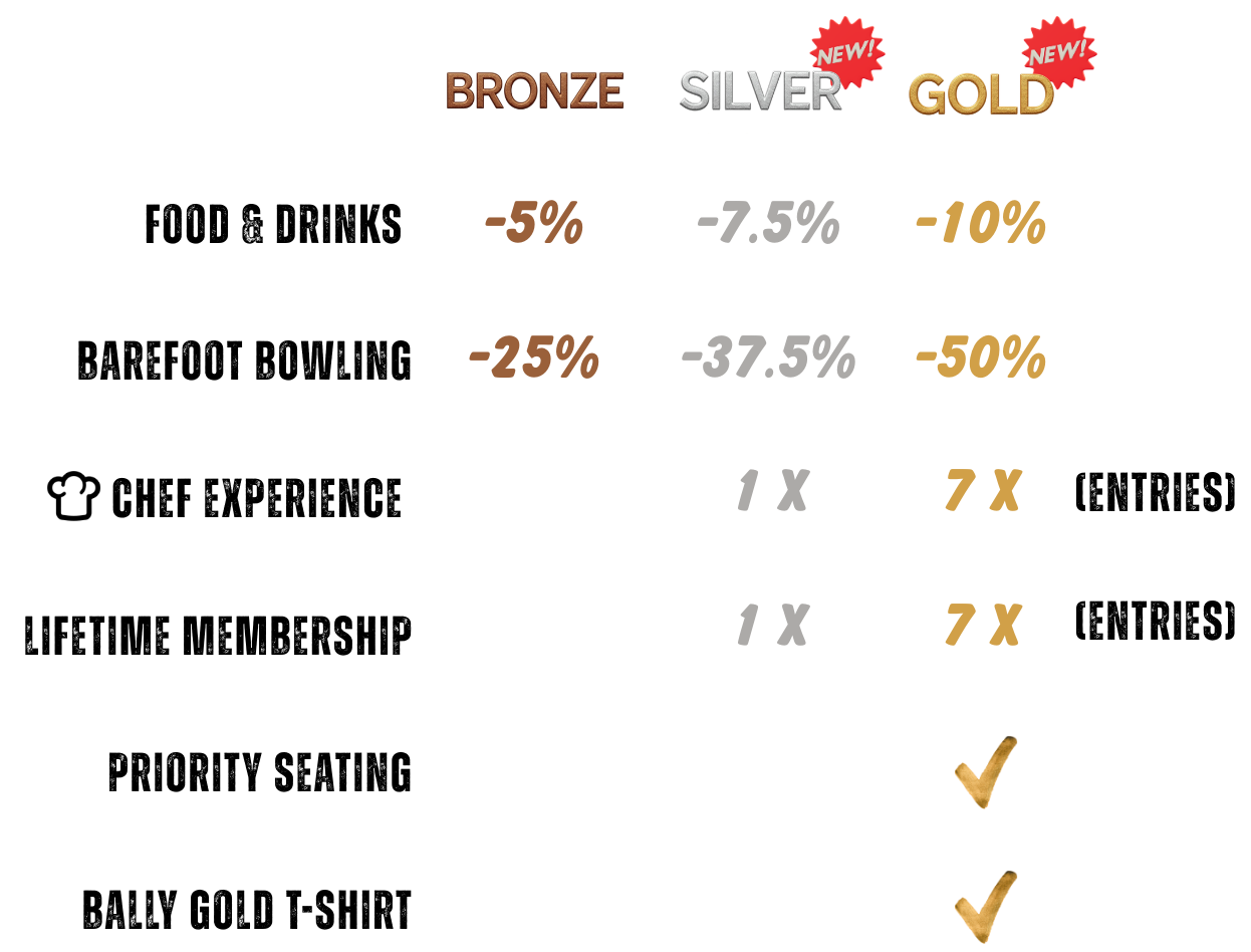 But Gold is about more than the discount. Priority seating when you book, a complimentary Bally T-shirt, and 7x entries into both prize draws — seven chances to win the Hatted Chef private dinner for 15 guests and seven chances at a Lifetime Membership. That's $4,750 worth of prizes, with the best odds in the room.
